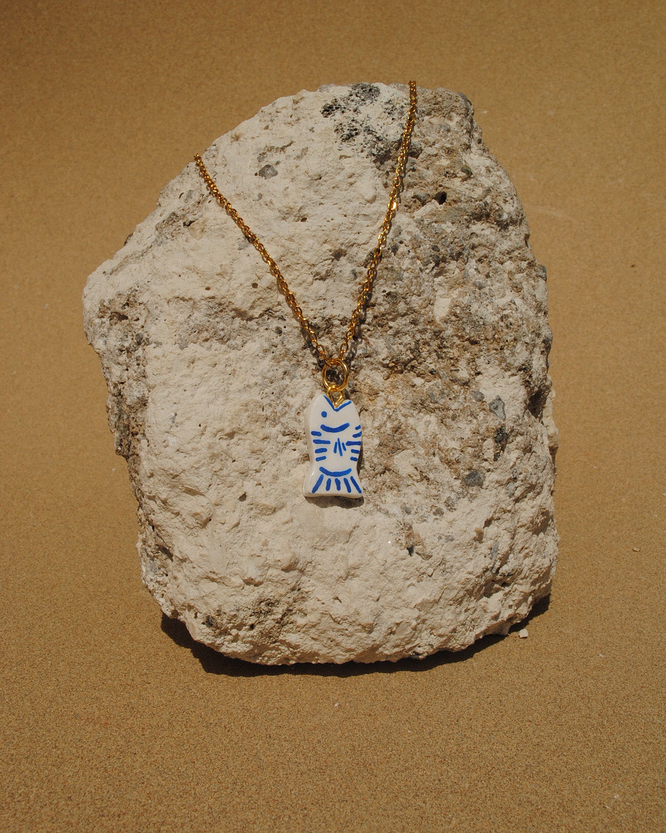Kék-fehér hal medál arany színű nemesacél láncon.