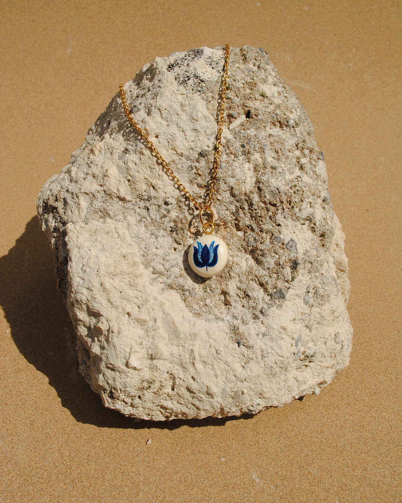 Kékfestő virág medál arany színű nemesacél láncon.