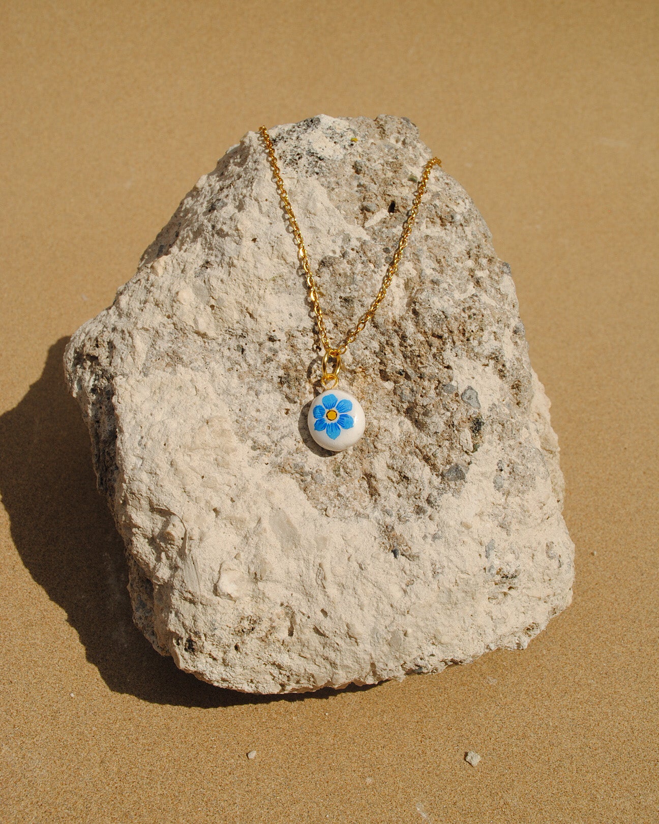 Kék virág medál arany színű nemesacél láncon.