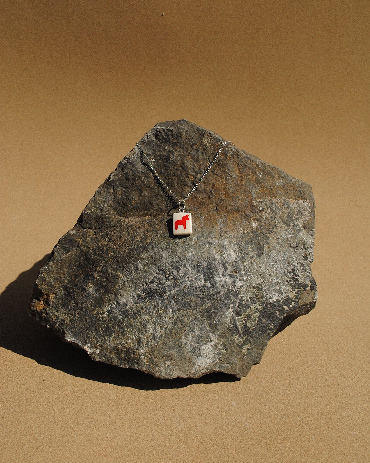 Piros csikó medál ezüst színű nemesacél láncon.