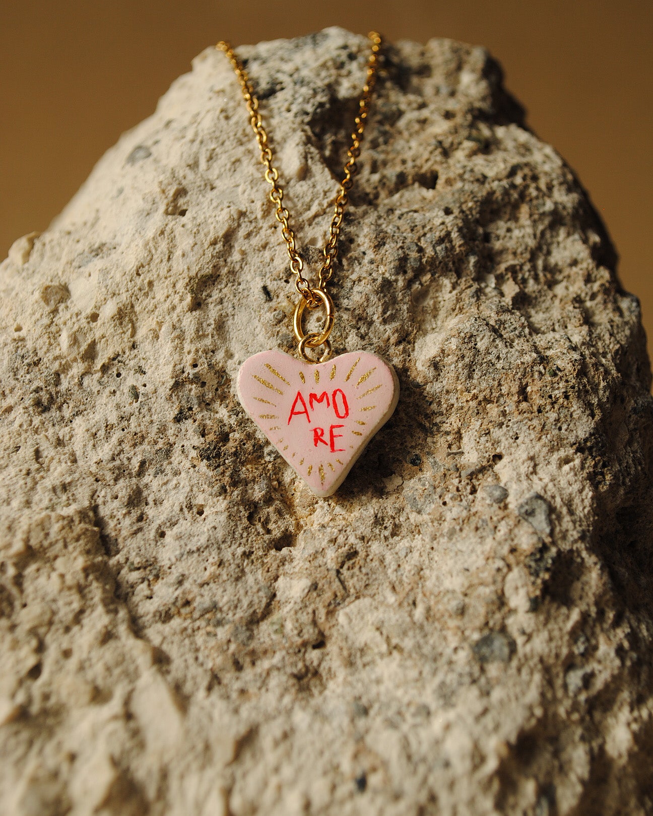 Rózsaszín amore medál arany színű nemesacél láncon.