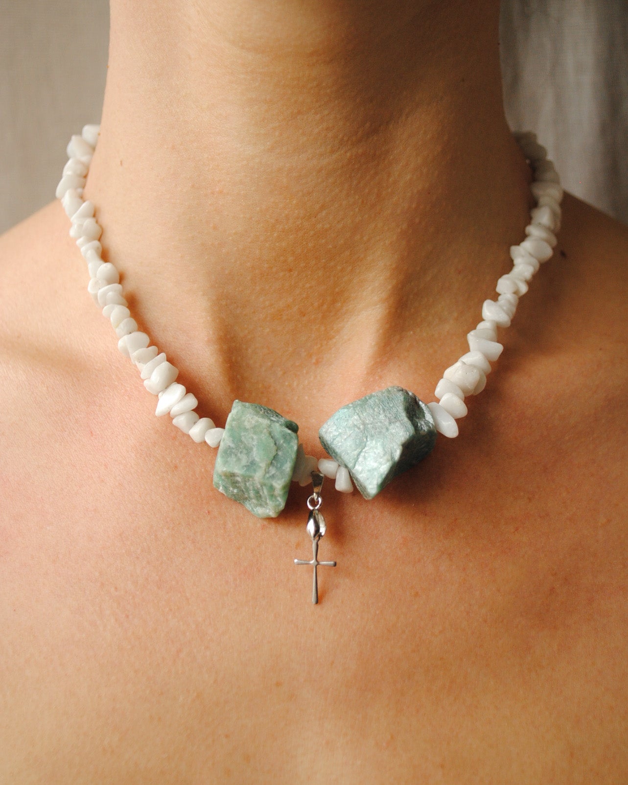 A Saint Rebel a kettősség ékszere — lágy, fehér howlit kövek és nyers amazonit energiák találkozása.