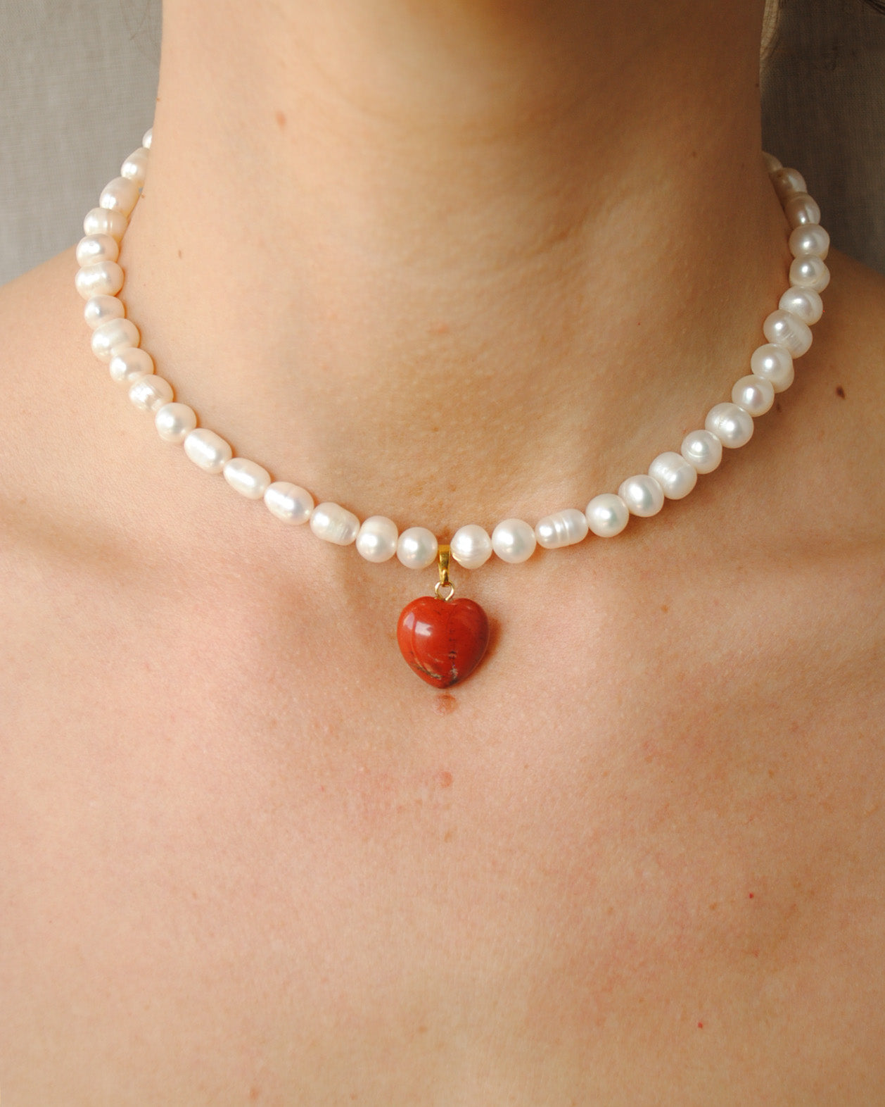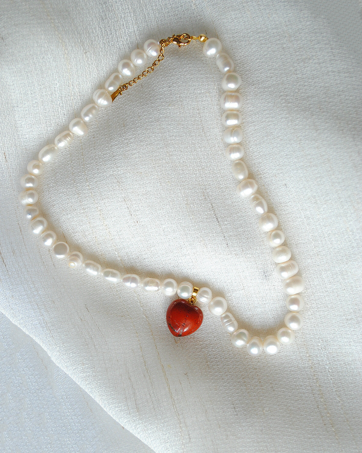 A piros jáde a szív energiáját ébreszti fel, miközben a gyöngy tisztaságot és érzelmi békét sugároz.